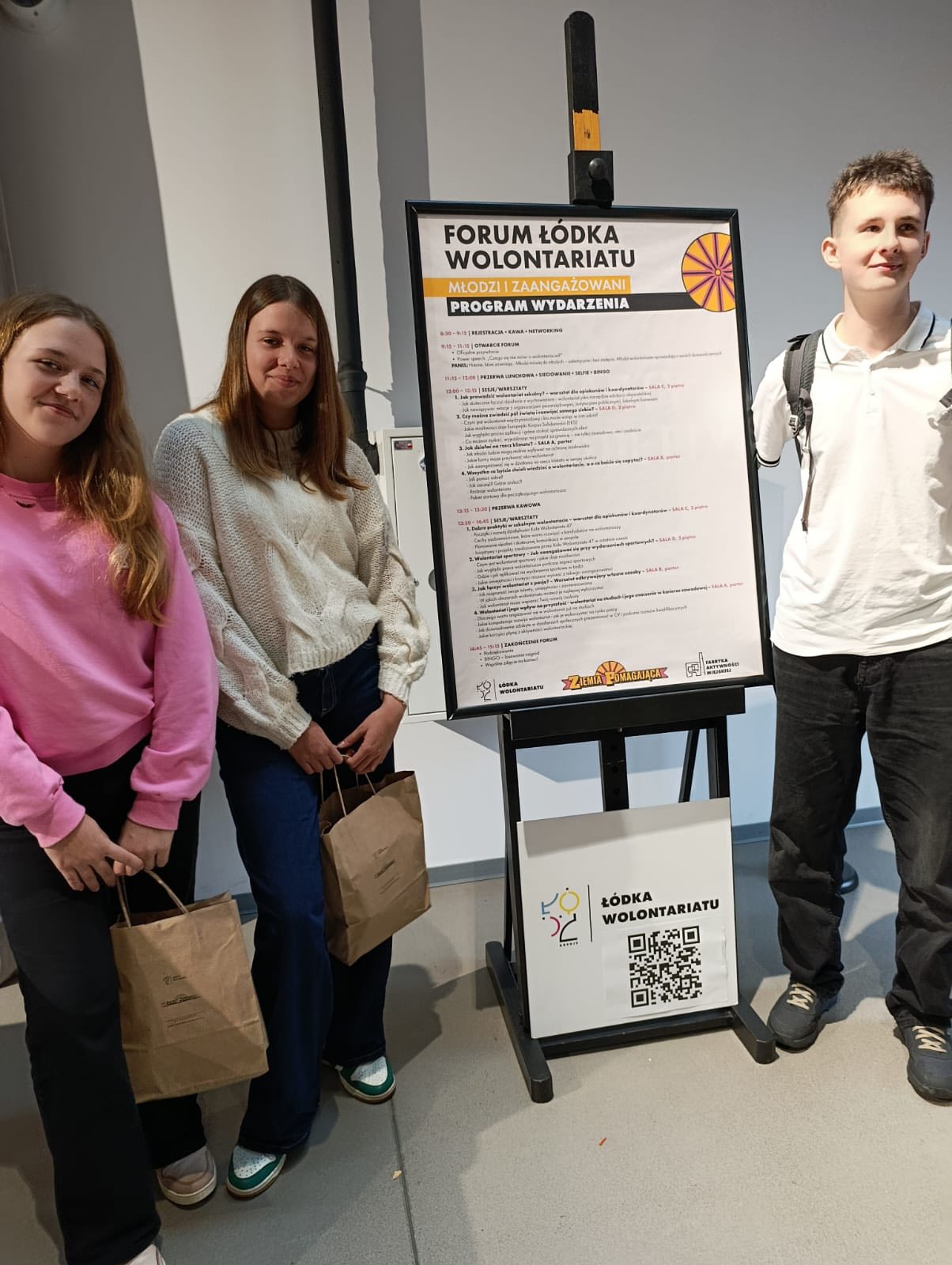 3 listopada 2025r delegacja wolontariuszy z klasy VIIIb wraz z opiekunem p. Anetą Benowską - Olko uczestniczyła w Forum Łódka Wolontoriatu "Młodzi Zaangażowani" organizowanym przez Urząd Miasta Łodzi, podczas którego uczestniczyli w warsztatach i sesjach dotyczących rozwoju wolontariatu szkolnego i jego wpływu na życie, przyszłość i wartości dzieci i młodzieży.