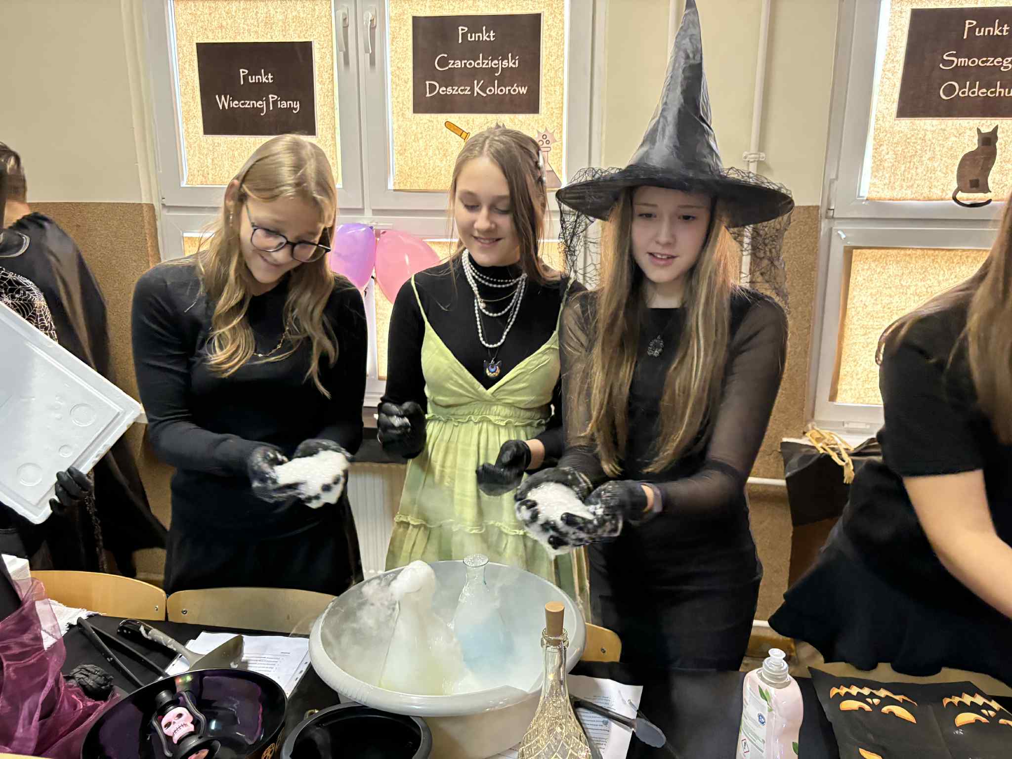 30 października nasza szkoła zamieniła się w prawdziwy Hogwart!! Pani Emilia Dorociak wcieliła się w Prof.Livię Luminę - Mistrzynię eliksirów i eksperymentów chemicznych – potrafiła zamienić zwykłe składniki w magiczne mikstury pełne kolorów, dymu i piany. Prof. Livia Lumina przybyła do Hogwartu SP 174, aby pokazać młodym czarodziejom, że chemia to prawdziwa magia! Tego dnia hol szkoły zamienił się w pracownię eliksirów Hogwartu, pełną kociołków, dymu, barw i czarodziejskich mikstur. Stoiska eksperymentalne prowadzone były przez wybranych uczniów klas 7-8 (w roli młodych czarodziejów i asystentów Snape’a!).