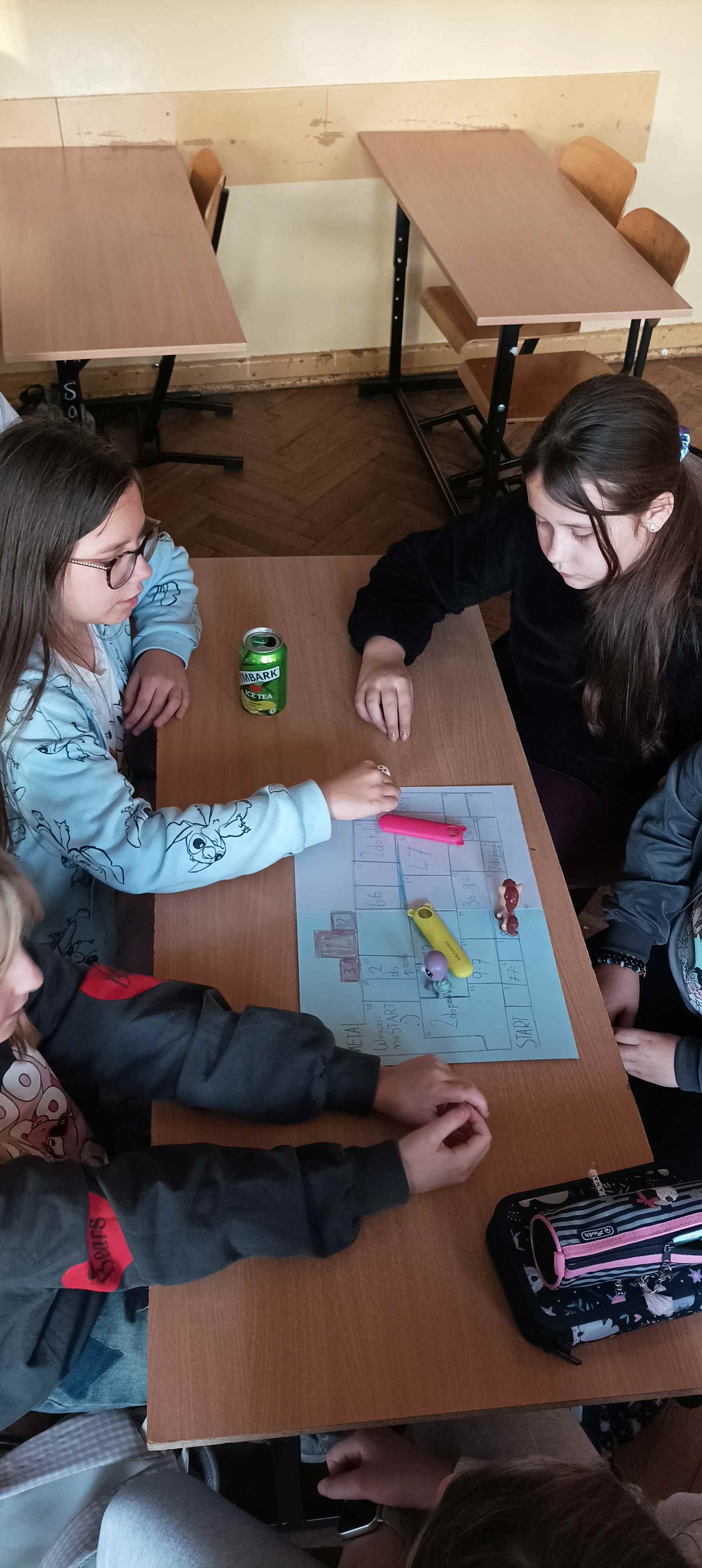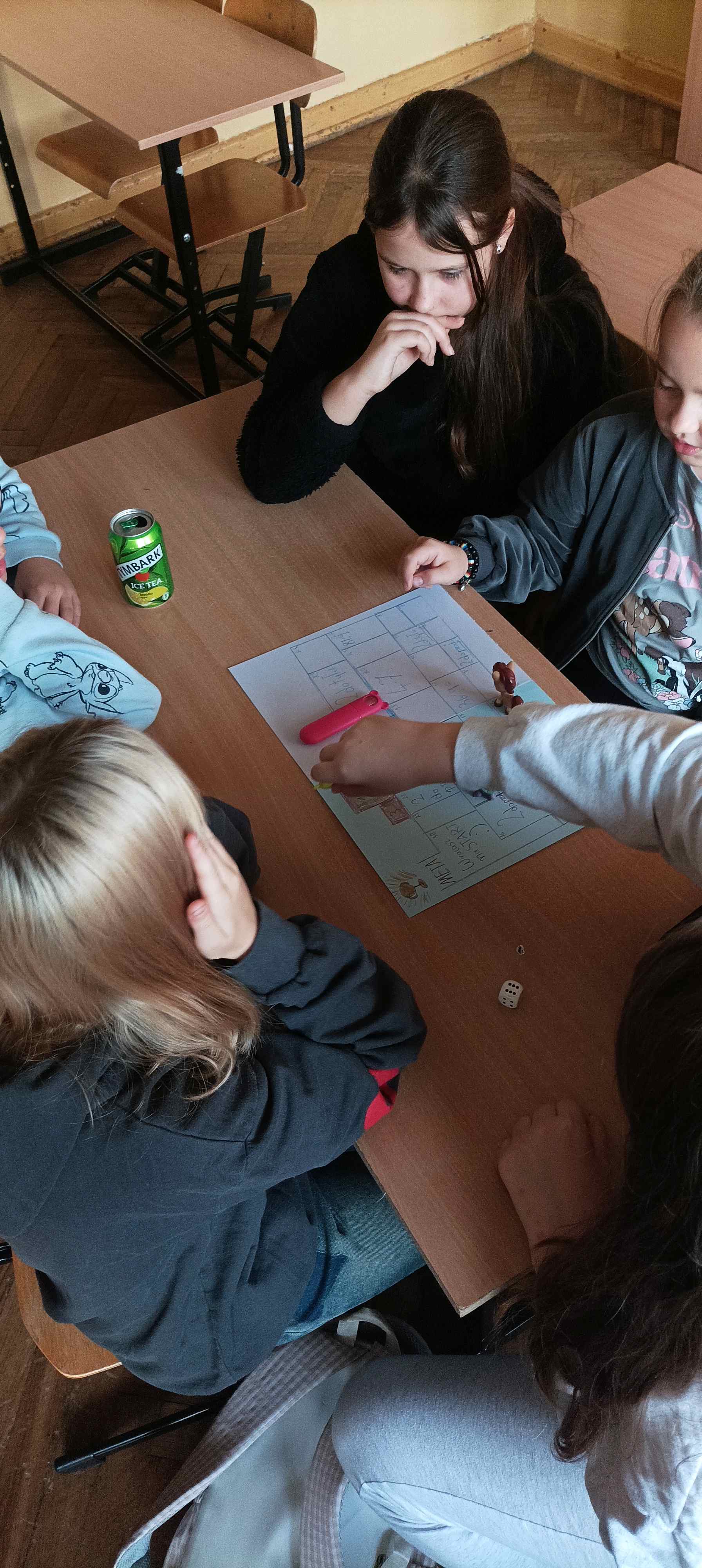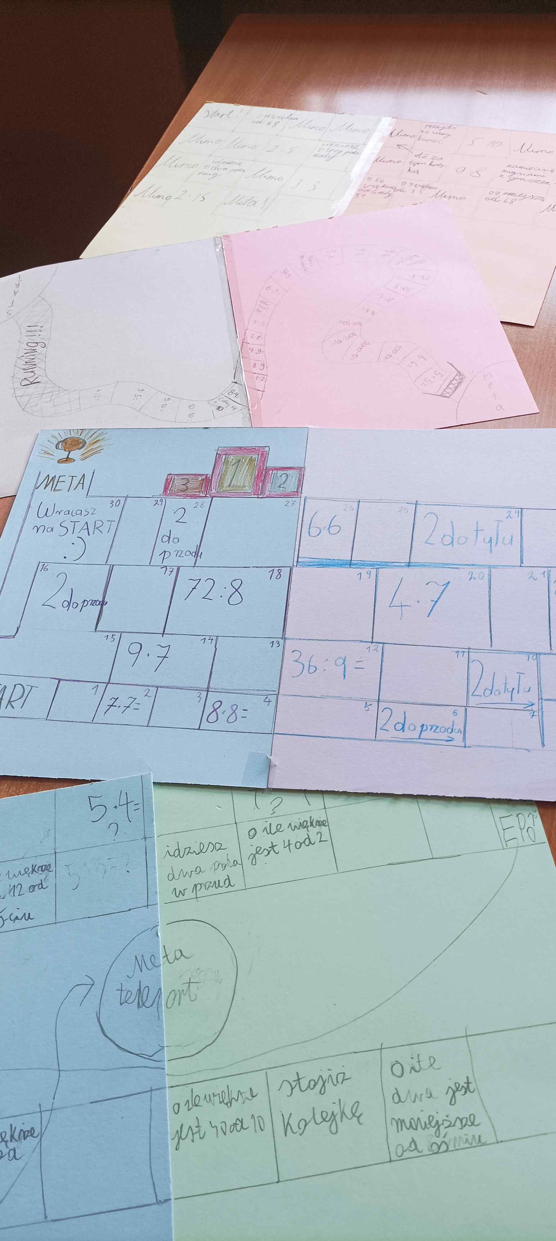 Na dzisiejszych zajęciach matematyki uczniowie klasy 4b pracowali w grupach, tworząc własne gry planszowe. Zadaniem było wykorzystanie zagadnień takich jak: tabliczka mnożenia, „o ile więcej”, „o ile mniej”, „ile razy więcej” oraz „ile razy mniej”. Każda grupa zaprojektowała planszę, opracowała pytania i zasady gry. Uczniowie dodali również pola specjalne według własnych pomysłów, np. „czekasz kolejkę”, „wracasz na start” czy „przesuwasz się na inne pole”. Dzięki temu nauka matematyki stała się kreatywną i angażującą zabawą!
