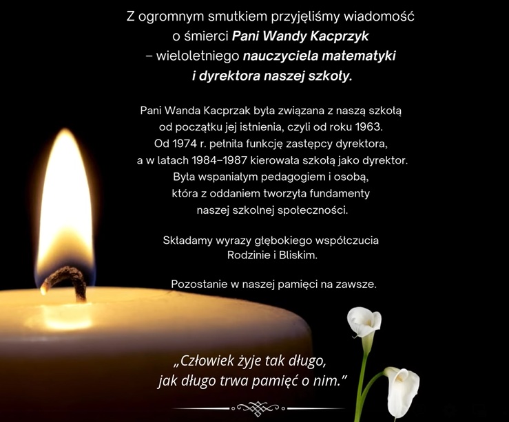 Z ogromnym smutkiem przyjęliśmy wiadomość o śmierci Pani Wandy Kacprzyk - wieloletniego nauczyciela matematyki i dyrektora naszej szkoły. Pani Wanda Kacprzyk była związana z naszą szkołą od początku jej istnienia, czyli od roku 1963. Od 1974 roku pełniła funkcję zastępcy dyrektora, a w latach 1984 - 1987 kierowała szkołą jako dyrektor. Była wspaniałym pedagogiem i osobą, która z oddaniem tworzyła fundamenty naszej szkolnej społeczności.
