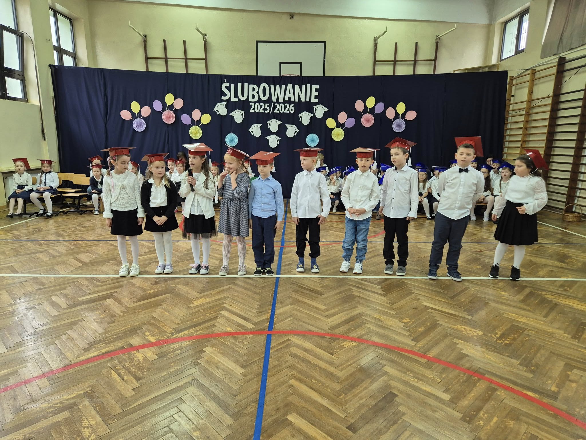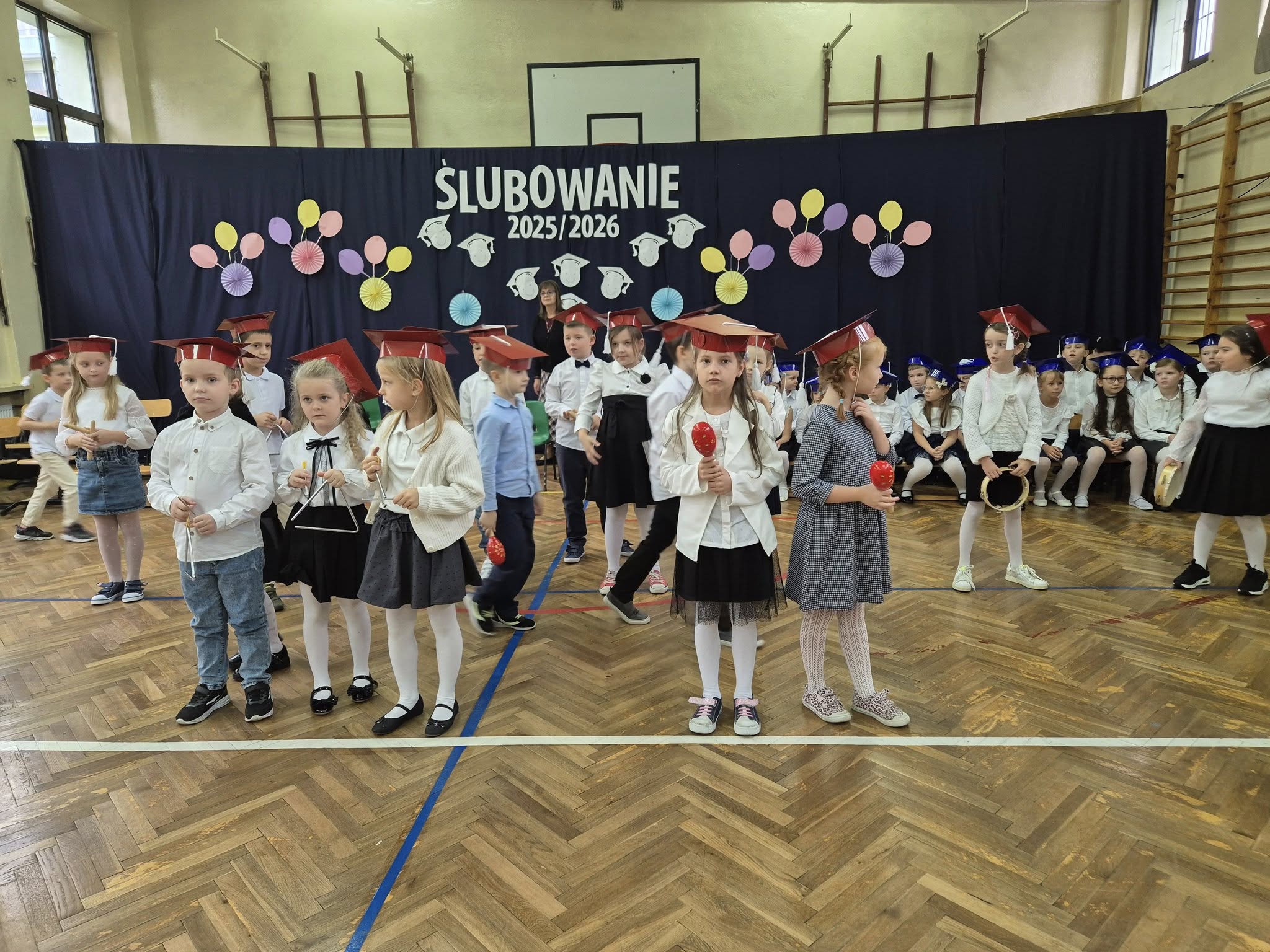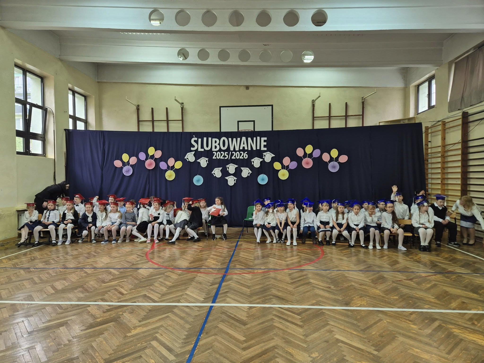 14 października w naszej szkole odbyło się uroczyste Ślubowanie i pasowanie na ucznia klasy pierwszej. W uroczystościach wzięła udział cała społeczność szkolna, którą przywitała Pani Dyrektor Beata Rubinkowska. Następnie pierwszoklasiści przedstawili część artystyczną, na którą składały się wiersze,piosenki, tańce oraz gra na instrumentach. Po występie odśpiewano hymn państwowy i hymn szkoły. Pierwszaki w pięknych biretach na głowach w podniosłej atmosferze przed pocztem sztandarowym ślubowali być dobrymi Polakami, godnie reprezentować swoją szkołę, oraz swym zachowaniem i nauką sprawiać radość rodzicom i nauczycielom. Po złożeniu Ślubowania Panie dyrektor; Beata Rubinkowska i Pani Anna Kordas, kolorowym ołówkiem dokonały symbolicznego aktu pasowania na ucznia. Po burzy oklasków pierwszoklasiści wrócili do klasy, gdzie czekały na nich słodkości przygotowane przez rodziców. Uroczysty dzień zakończyły pamiątkowe zdjęcia.
