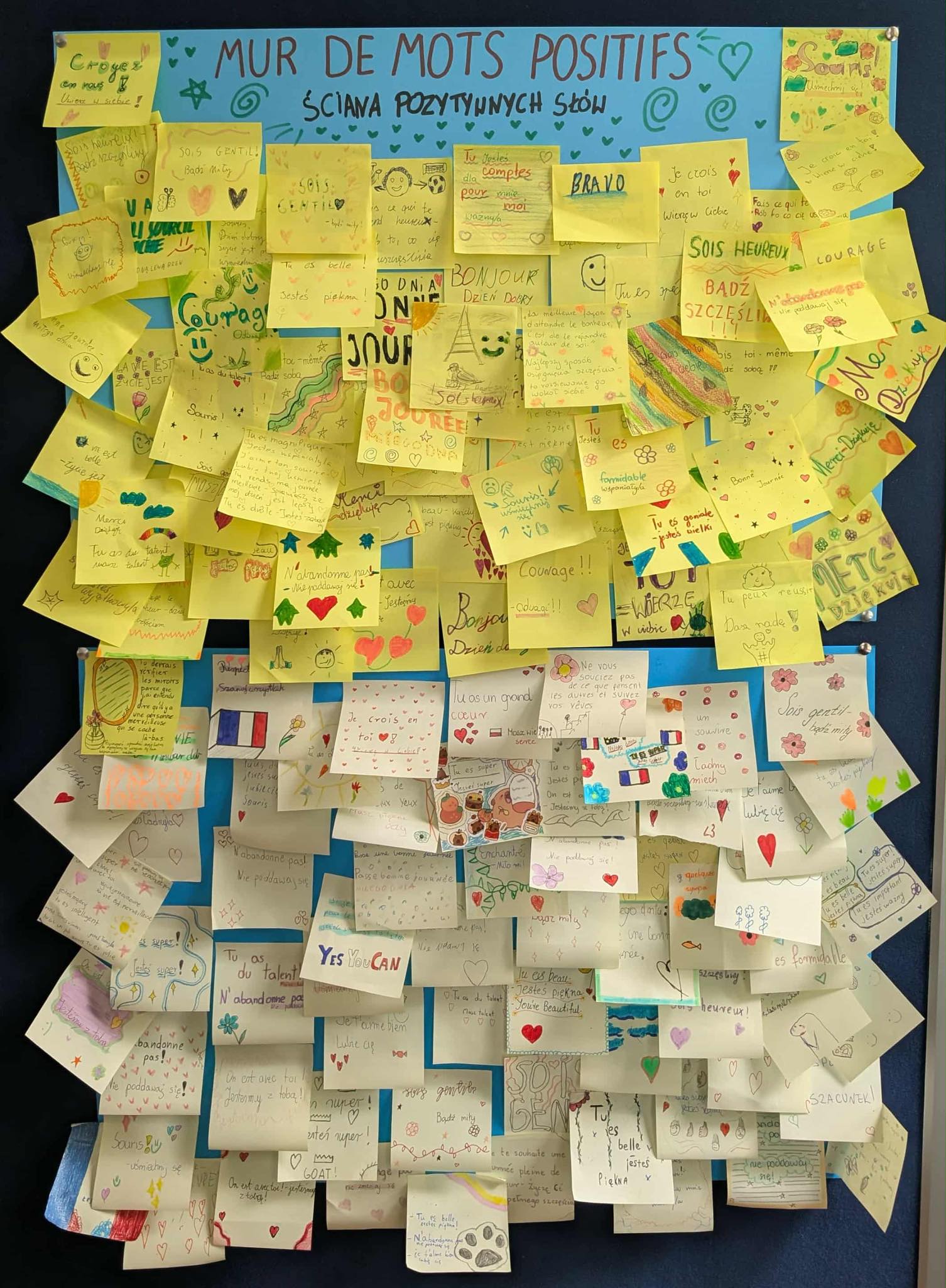 Z okazji Ogólnopolskiego Tygodnia Przeciwdziałania Przemocy Rówieśniczej (29.09–3.10.2025) oraz VI Ogólnopolskiego Tygodnia Szczęścia w Szkole (29.09–5.10.2025), uczniowie klas 7–8 wzięli udział w wyjątkowej akcji! Każda klasa przygotowała dwujęzyczne (francusko-polskie) karteczki, na których uczniowie zapisywali miłe słowa, dobre myśli i komplementy dla innych.