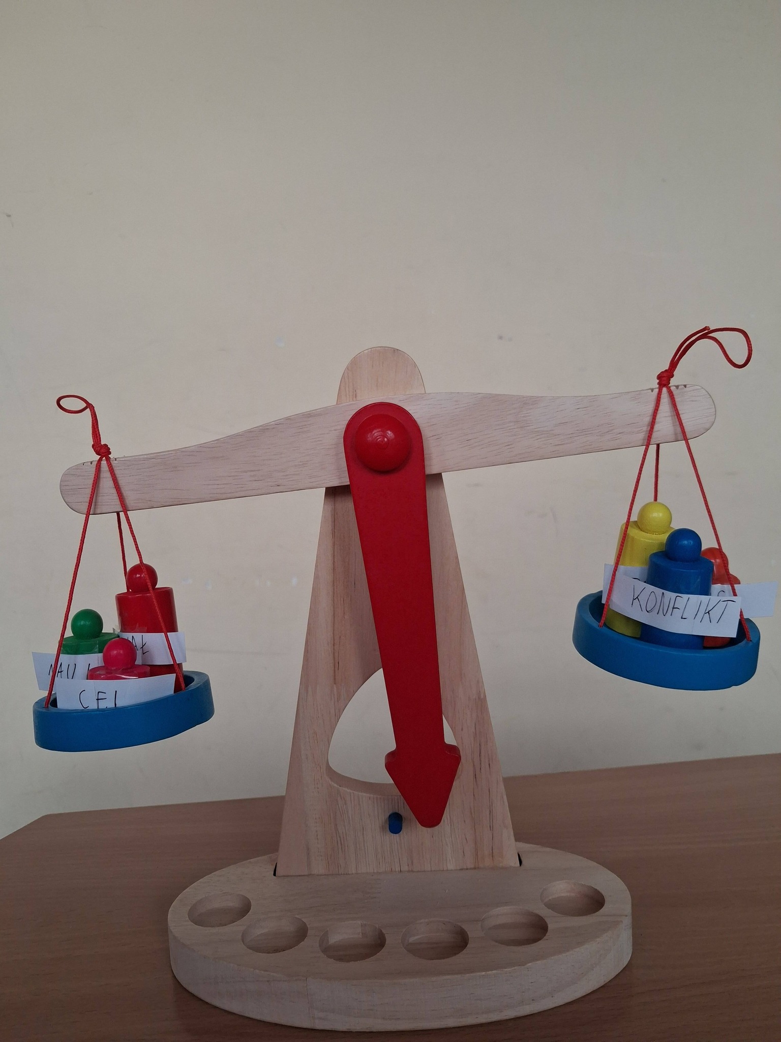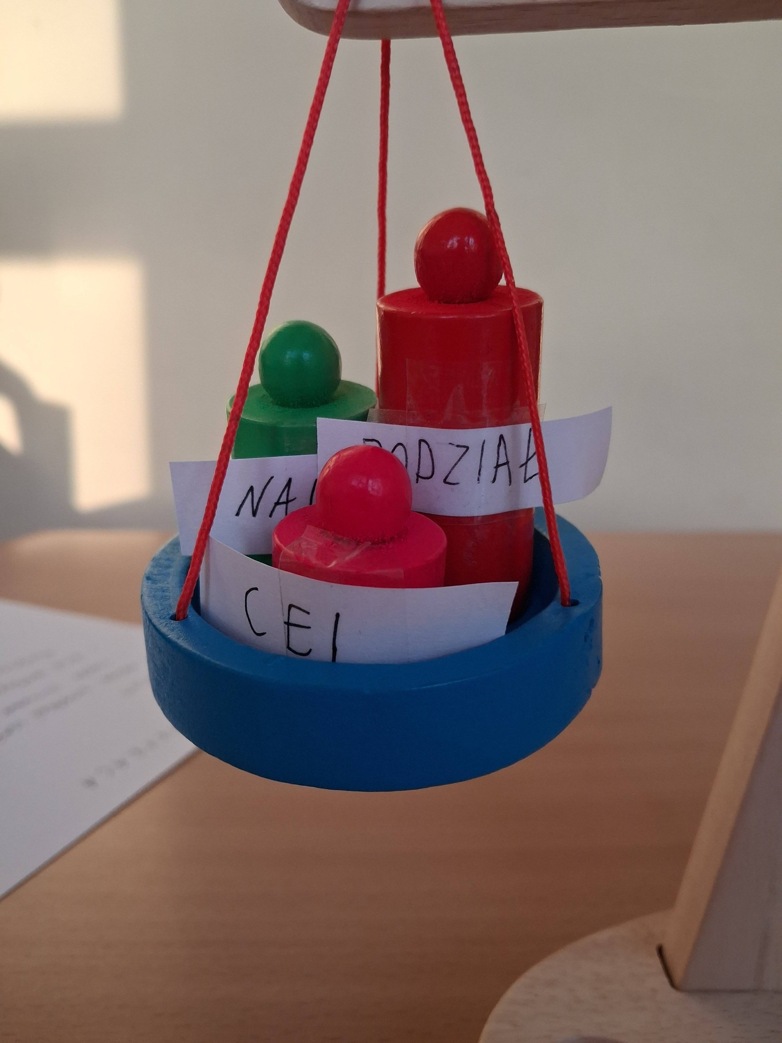 Wykorzystując wagę ważyliśmy plusy i minusy współpracy oraz zastanawialiśmy się czego musi być więcej, aby wspólnie osiągnąć zamierzony cel. Rozmawialiśmy także o roli konfliktu w relacjach i sprawdzaliśmy, czy współpraca zawsze się opłaca. Temat wzbudził dużo emocji i był przedmiotem długich dyskusji.